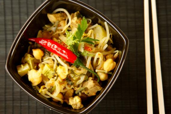 Numa caçarola aquecida, acrescente o azeite. Depois adicione o alho e a cebola. Coloque a carne e deixe dourar. Diminua o fogo e coloque tomate, grão-de-bico cozido, extrato de tomate e a pimenta. Refogue. Cubra com água e mexa bem. Deixe levantar fervura e adicione o resto dos ingredientes, menos o broto de feijão. Misture. Deixe semi-tampado até formar um caldo espesso. Acrescente o broto de feijão já com o fogo desligado. Sirva quente.