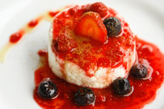 Amasse as framboesas em um peneira para ficar um purê, depois misture com a água de rosas. Como alternativa, bata no liquidificador ou processador de alimentos e depois peneire para remover as sementes. Corte a ricota em seis e disponha em pratos de sobremesa com as frutas vermelhas mirtilo, morango e framboesa). Regue com mel e o purê de framboesas. Salpique a canela em pó. (Culinarista: Chef Andressa Dias)