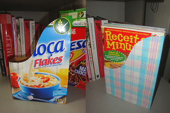 Olha que ideia simples, porém muito criativa das meninas do blog Uma Aspone Qualquer e do Flickr da =Mimi=. Elas fizeram um porta livros com caixa de cereal usada, para aquelas pessoas que guardam muitos livros na prateleira e terminam fazendo uma grande bagunça. Se você é uma dessas pessoas e deseja organizar melhor a velha bagunça, basta uma tesoura, um pouco de criatividade e mãos a obra.